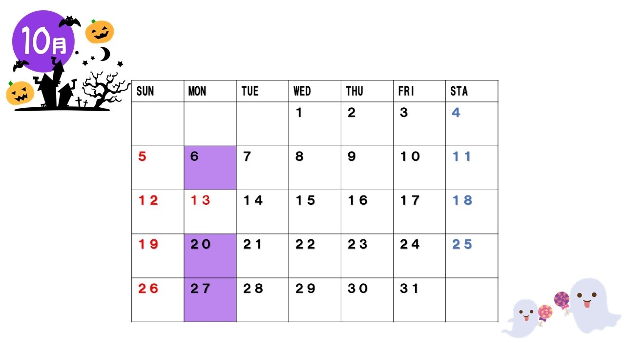 本日は10月のお休みのお知らせになります。
