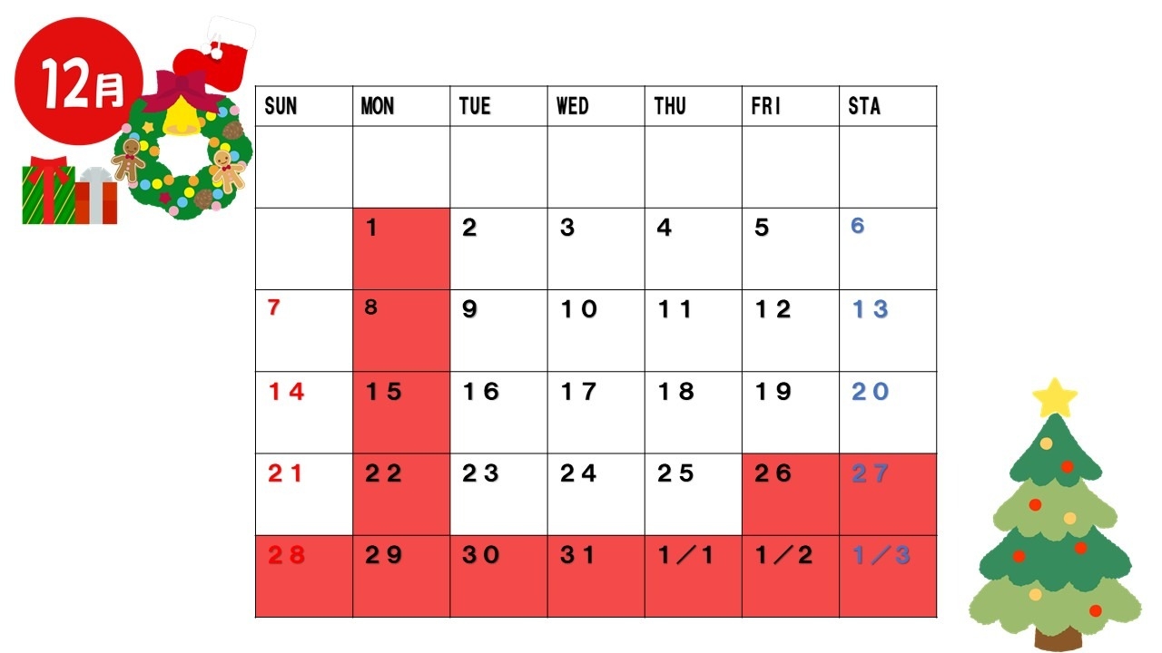 また、26日~1月3日まで年末年始の長期休業となりますので