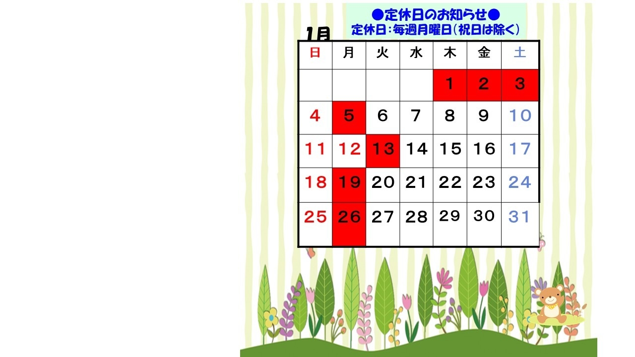 営業時間変更に伴い祝日月曜日営業の翌日は定休日となります。