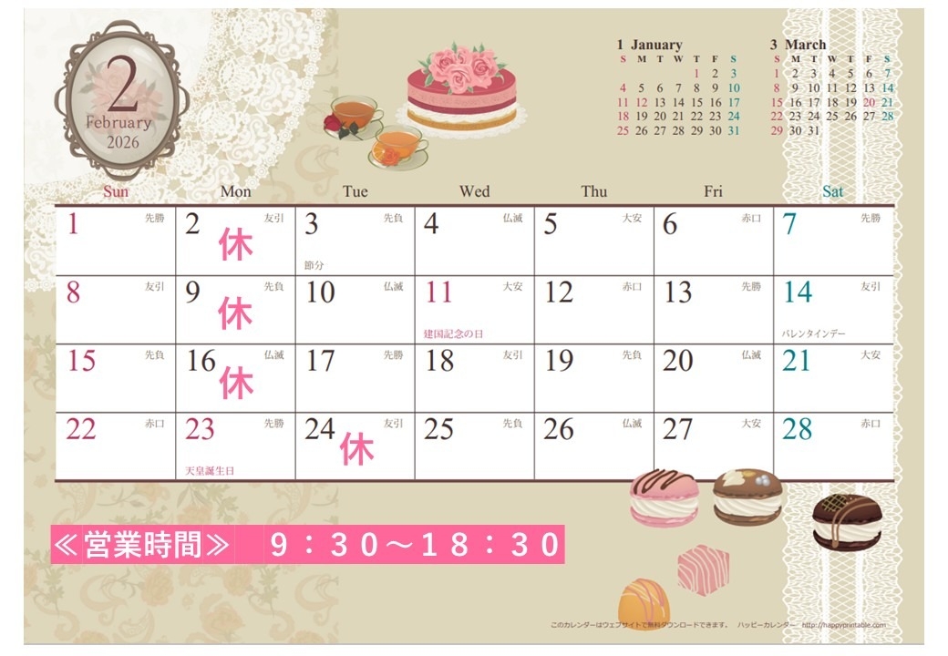 2月定休日のご案内♪ 2026.02.01 こんにちは! トヨタカローラ千葉勝田台店です。 本日は、2月の定休日のご案内をさせていただきます♪ 1月より営業時間が変更になっておりますので お間違えの無いようよろしくお願いいたします。 肌寒い日が続きますので体調に気を付けてお過ごしください♪ 前の記事へ 店舗ブログ一覧に戻る 次の記事へ