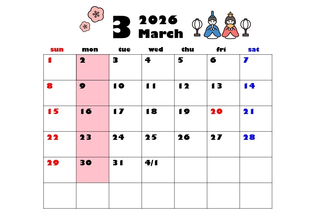 さて本日は、3月の定休日のご案内をいたします。