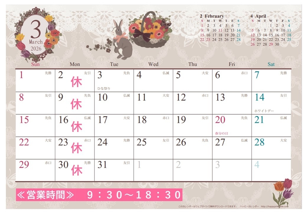 3月定休日のご案内♪ 2026.03.03 こんにちは! トヨタカローラ千葉勝田台です(^^) 2月もたくさんのご来店、誠にありがとうございました。 さて、3月の定休日のご案内をいたします♪ 3月は毎週月曜日以外、営業しております('◇')ゞ みなさまのご来店を心よりお待ちしております☆彡 まだまだ肌寒い日が多いですので、風邪などに気を付けてお過ごしください☺ 前の記事へ 店舗ブログ一覧に戻る 次の記事へ