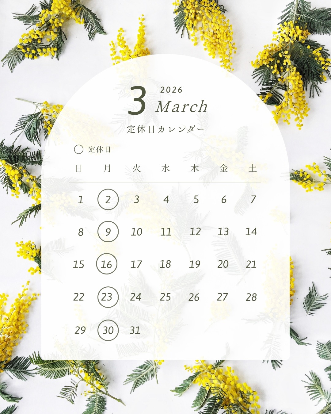 また、3月の営業日カレンダーも