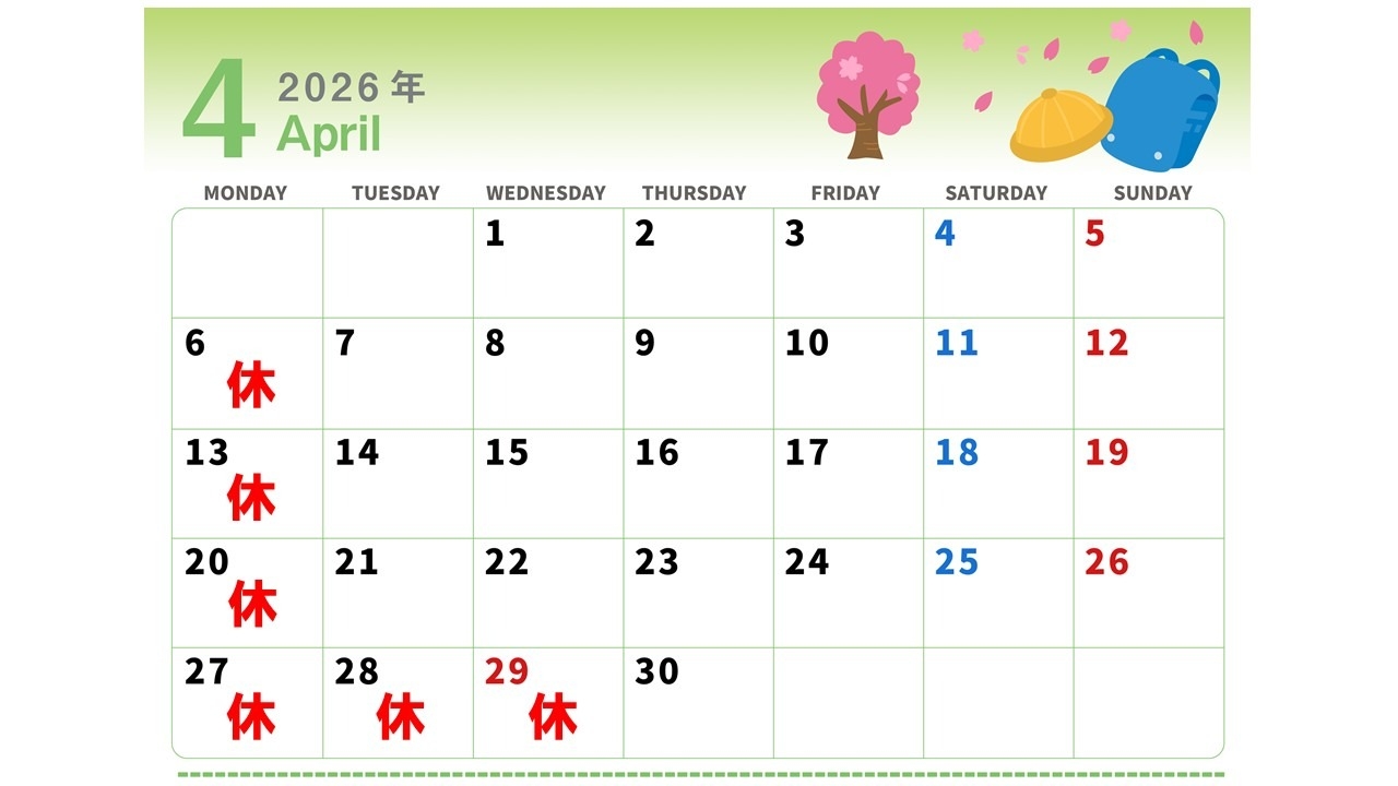 4月は6(月)・13日(月)・20日(月)・27日(月)・28日(火)・29日(水)の