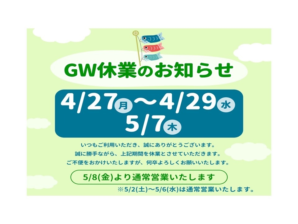 本日は【ゴールデンウィーク休業】のご案内でございます!