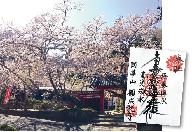 弘安3(1280)年、北条久時創建と伝わる。その名称から「良縁成就」で知られ参詣者が絶えない。境内の五輪塔は全国的にみても珍しい形状を持つ東金市指定文化財。山門のしだれ桜をはじめ数多くの桜木が植えられ、春爛漫の彩りに包まれる。